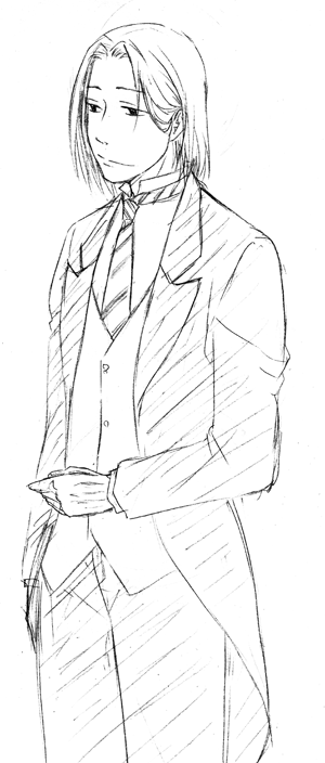 執事服の資料がうっかり黒〇事しかなかったので見ながら描いたけど面倒くさくなって小物色々描くのやめたよ。落書きだから気にしない。